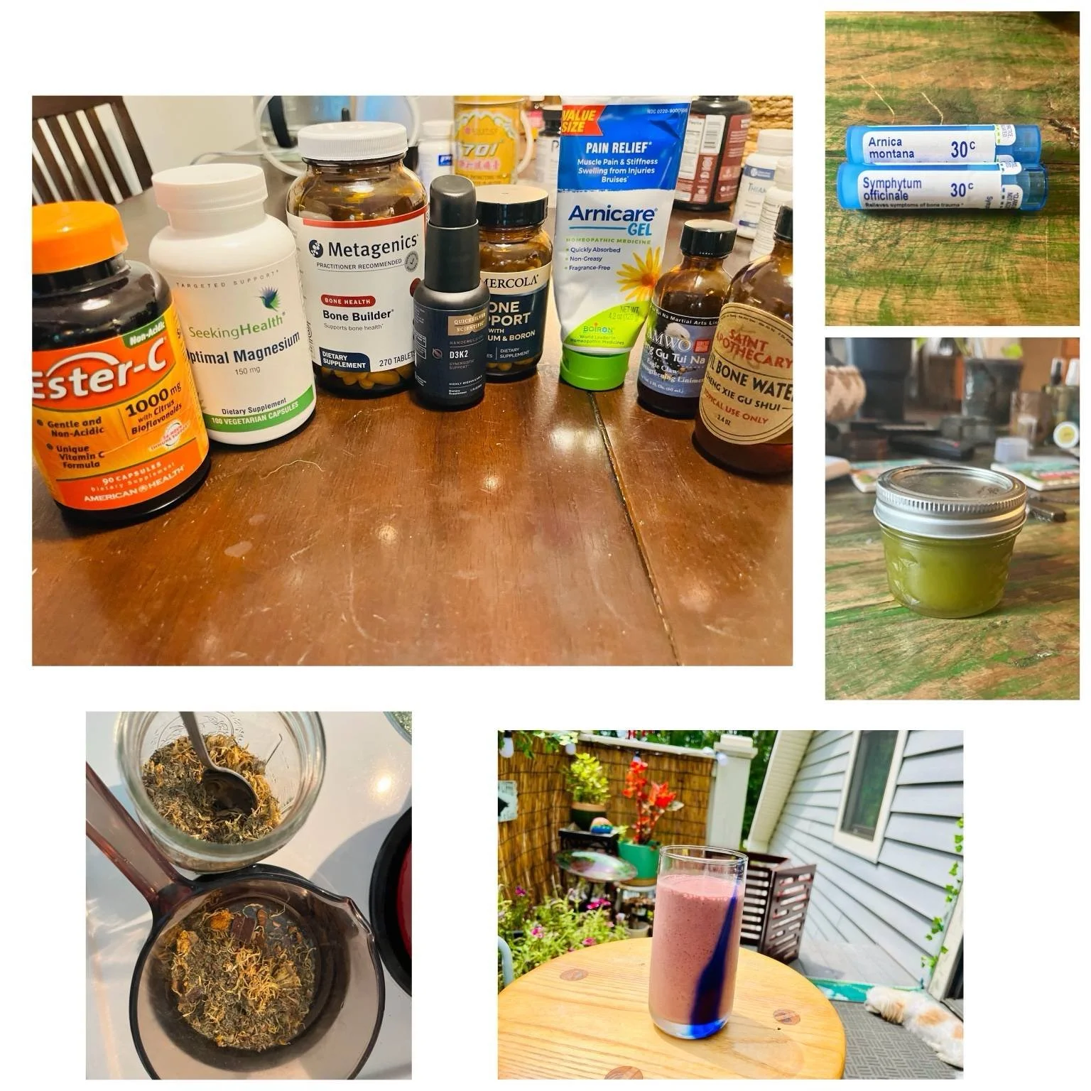 Internal Support: I’m using a core lineup of supplements including Vitamin C, magnesium, D3/K2, and bone-building formulas to help with mineralization, inflammation, and nerve repair. Plus: Arnica montana and Symphytum officinale (comfrey) for trauma, bruising, and bone support — these tiny pellets carry big power.